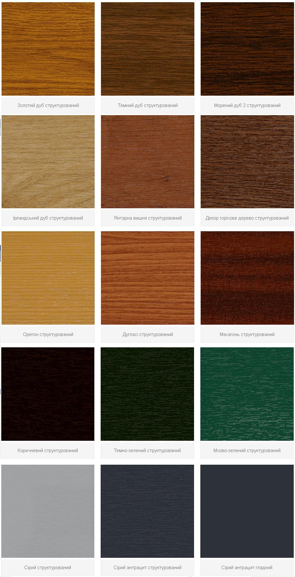 зовнішнім виглядом алюмінієвих вікон. Палітра кольорів охоплює всю кольорову гаму RAL.