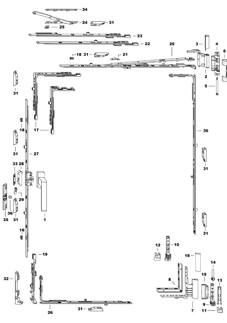 Загалом вся схема роботи фурнітури полягає в тому, щоб від ручки передати тягу до точок притиску і запірним