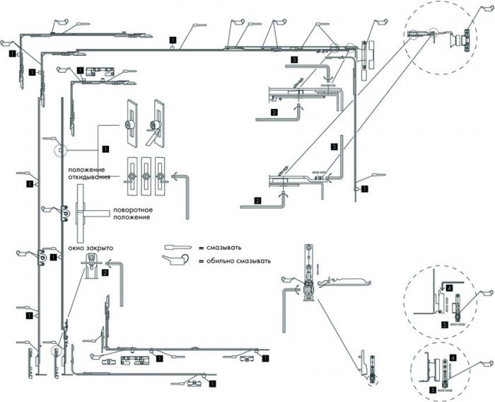 Періодично, одного разу на рік фурнітуру треба змащувати, схема змащування вказана нижче. Ця робота виконується самостійно.